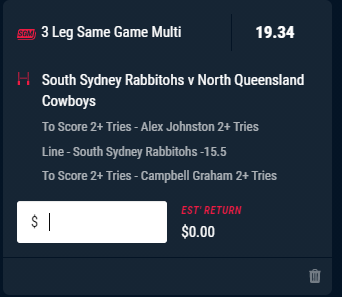 Rabbitohs Doubles SGM - Stake 0.5 Units, Minimum Odds 15, Best Book - Pointsbet