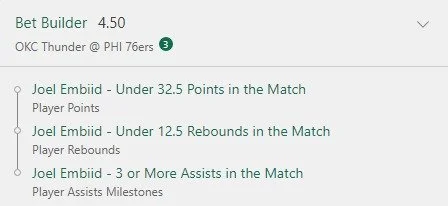 Okay so Joel has been in great form especially over the past month or so. There are a couple of reasons I'm happy for us to bet the under here. First the 76ers are 14 point favorites in this matchup. Joel generally plays 30 minutes or less in blowouts. So if it heads that way his minutes will decrease which means a decrease in production. Could he bust this line in 30 minutes or less? Sure. But it's less likely that if he plays 36+ minutes. Also the Thunder have been surprisingly good defending Centers. Even with his great form he's hit this line 6 of his last 17 games. Lets go Joel, get your work done early 🔥🔥🔥