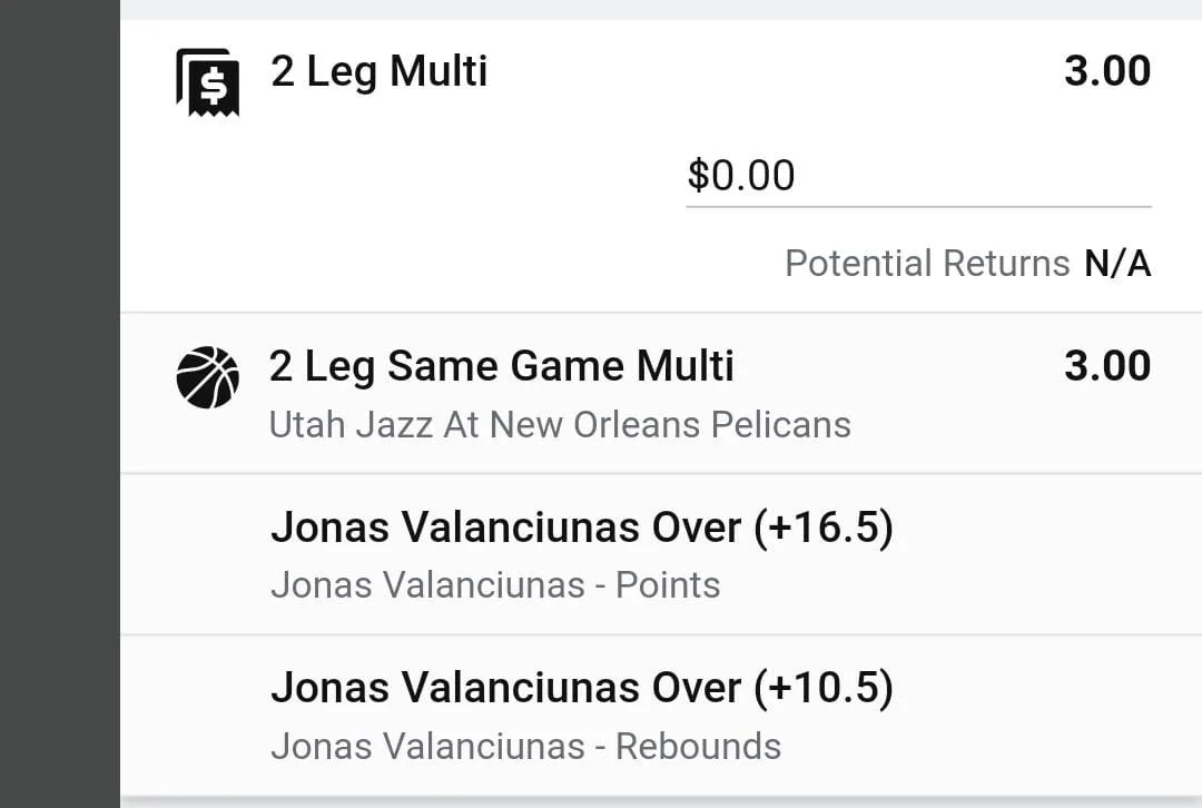 Ok so Jonas averages 18.5ppg 12rpg. There's a couple of factors at play against this bet #1 matchup he's struggled in 2 earlier matchups with the Jazz this season. #2 returning from an absence. Overall though he's hit this line in 17 of the 33 games he's played this season and we're seeing great value especially considering Brandon Ingram is listed as questionable. Go Jonas 🔥🔥🔥
