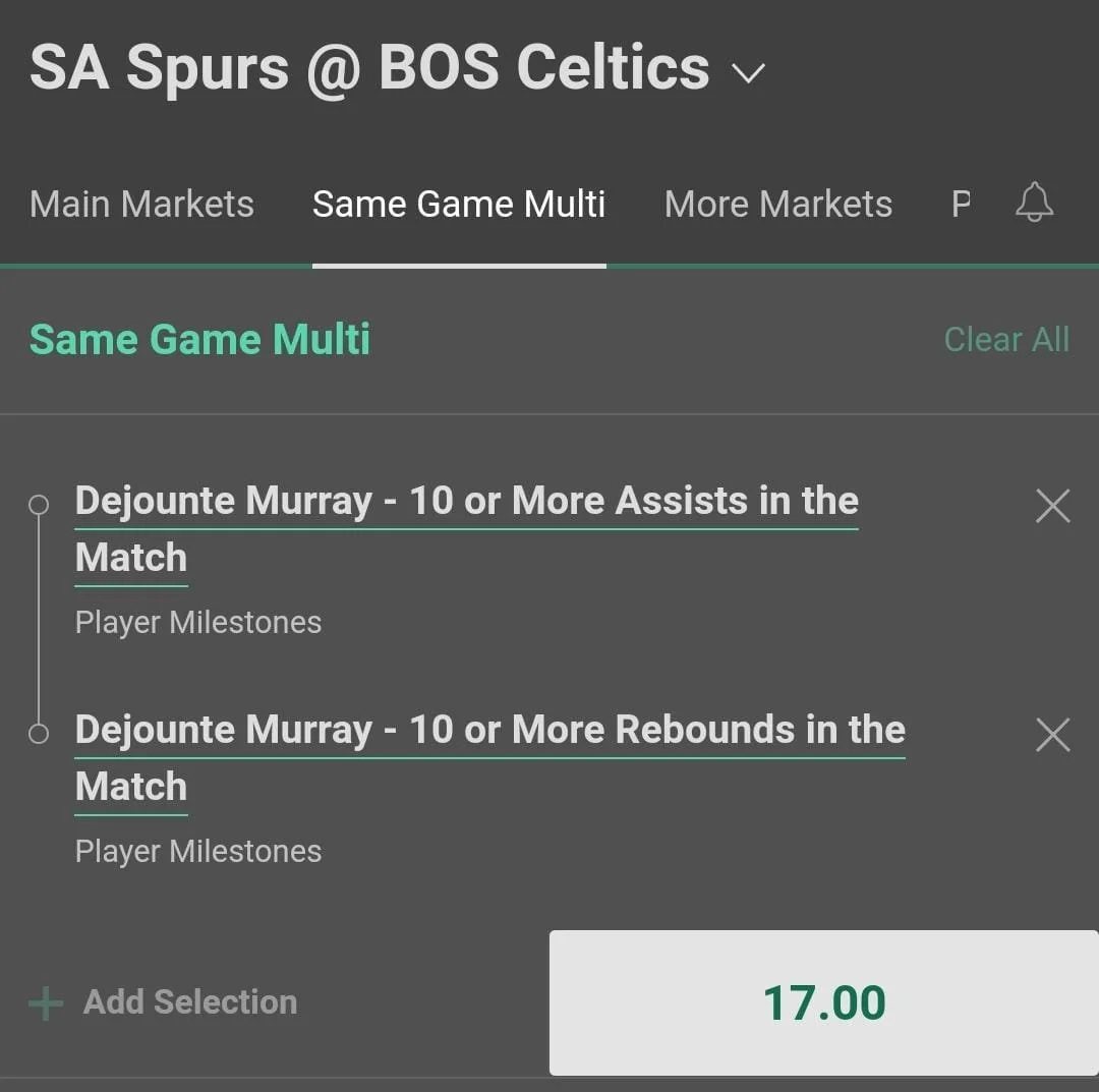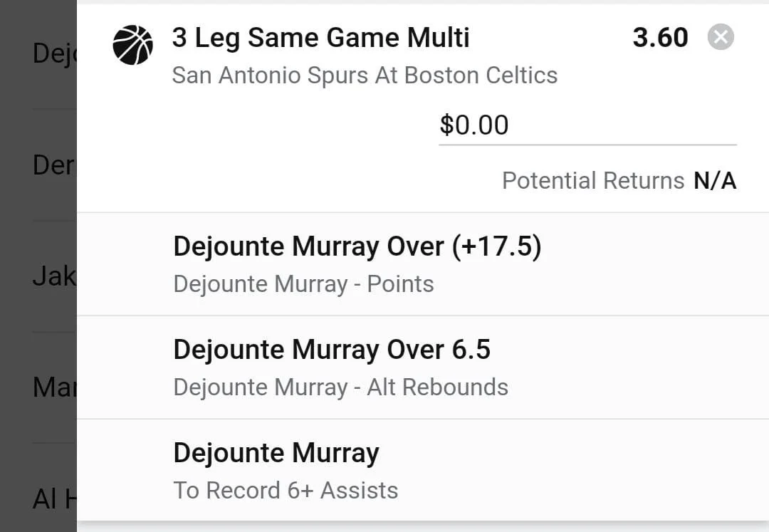 Dejounte has hit this line plenty this season. He averages 17.8ppg 8.4rpg 8.8apg. The only question is what effect being out has had. But at these odds I really like the play and am happy to take the bet. Go Dejounte 🔥🔥🔥