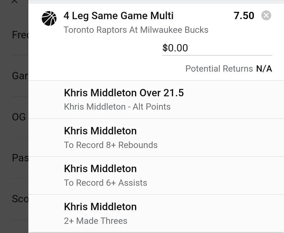 No Giannis in the lineup today and we're betting on Khris to take a step up. In games without Giannis this season he's gone close. And last season he averaged 21.6ppg 6.3rpg 5.8apg. I like Khris chances here. Go Khris 🔥🔥🔥