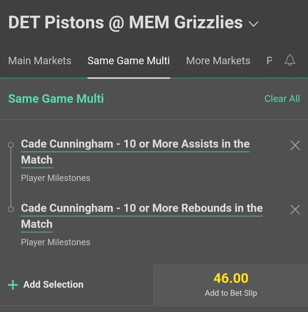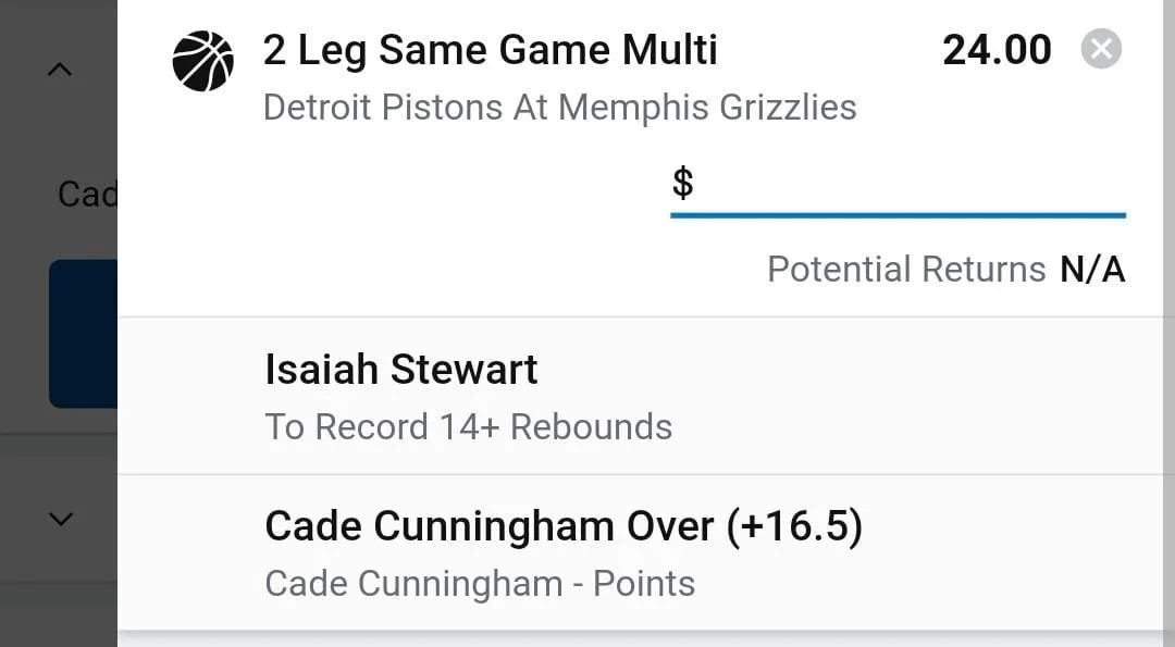Isaiah Stewart x Cade Cunningham 1 unit. Take odds over $15. They've combined for these lines in 3 games this season. But importantly 2 of the last 10 they've played together. I think we're getting pretty good value here for a small play. Go Cade and Isaiah 🔥🔥🔥