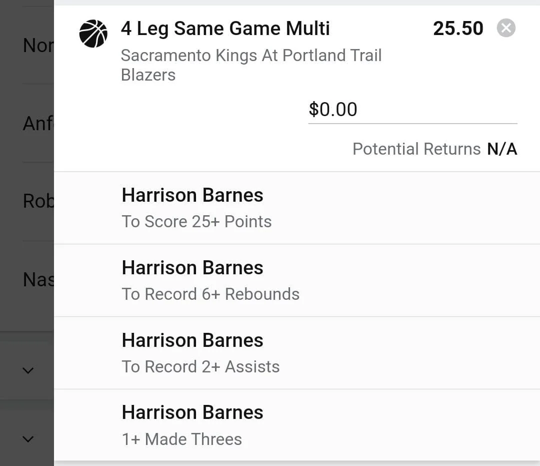 Ok, here we go Barnes has been out of form and been taking fewer shots of late. However, I like this bet for a couple of reasons today. #1 De'Aaron Fox is listed as questionable if he's not good to go that should mean more opportunity for Harrison. #2 He's already put up a 36 point performance vs the Trailblazers this season so we've seen him score in the matchup. Go the Black Falcon 🔥🔥🔥