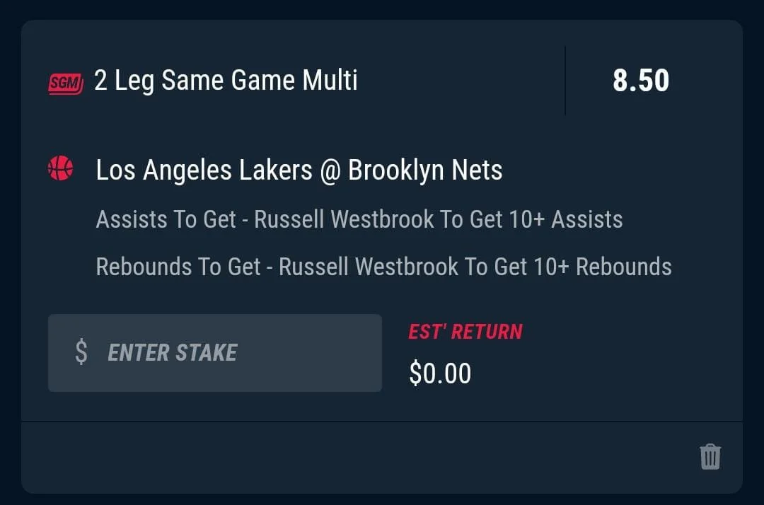 Russell Westbrook 1 unit. Take odds over $6. Both of these teams are top 10 in the NBA in Pace. I think we could see a game with over 180FGA. That would be a nice opportunity for Russ to hit his second 10-10 of the season against the Nets. Go the Brodie 🔥🔥🔥