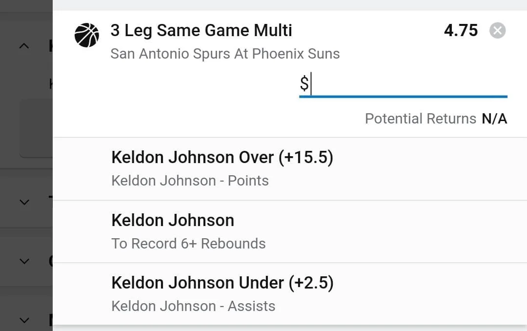 Keldon has a big opportunity here today. With Poeltl, White and Dejounte Murray out someone will have to step up. Betting on that being Keldon Johnson here. Now when I watch Keldon play his tendency is definitely to score more than assist and he's averaging 15.1ppg 6.2rpg 1.7apg. Let's go the big body. Do some big work 💪💪💪
