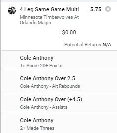 Ok a couple factors at play here. The Magic are working a few young guards into the lineup. In my opinion Cole has been the best of the lot and his production has been the best. In the first matchup with the Timberwolves this season Cole went 31-9-8. As long as he gets the minutes I think he'll give the above line a good shot. Lets go Cole 🔥🔥🔥