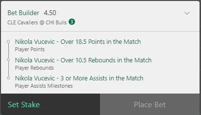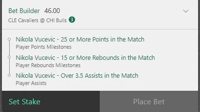 I like this bet for a combination of factors. He's hit this line 12 games this season. But 4 of 12 without Zach LaVine averaging 21.9ppg 11.3rpg 3.4apg. Another reason I like this bet is Jarrett Allen is out of the lineup for the Cavaliers and I think this opens up possibilities for Vuc. He put up 24-12-3 in the last matchup with the Cavs and we're looking for the same here. Ideally bet this 15 minutes before tipoff to confirm LaVine is out of the lineup. If LaVine is in we'll need better odds perhaps I'd be willing to take $6 to hit this. Go Vooch 🔥🔥🔥