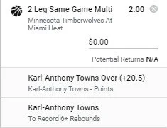 Now pretty plain bet but let me explain. KAT has hit this line in close to 70% of games this season. He is very capable of it. Up against one of the best defenders in the NBA in Bam Adebayo so the matchup will be tough for sure. But... In 7 career matchups vs Bam he has hit this line 4 times and is averaging 21.7ppg 10rpg 4.1apg with a few big games in that mix. Lets go KAT 🐅🐅🐅