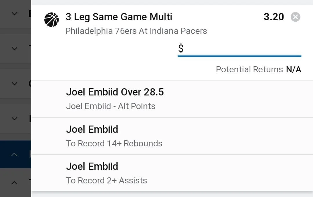 5 of his last 5 games. Context here is he's playing for the MVP and finds a nice matchup against the uptempo Pacers. Key danger is a blowout. If that happens his minutes maybe reduced. Otherwise I really like this bet. Philadelphia are incentivised to play to win due to playoff positioning. Go Joel 🔥🔥🔥