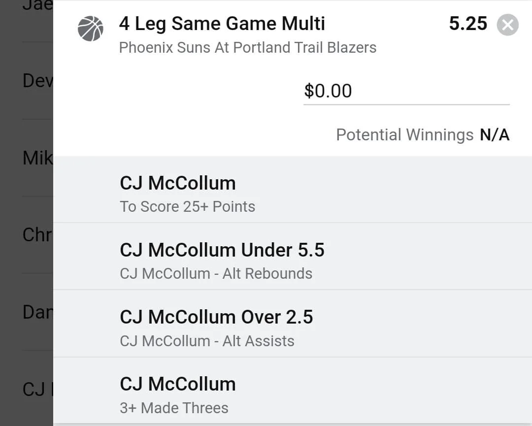 CJ was a tried and true Same Game Multis performer last season and went very close for us in the Blazers season opener. He's fairly solid player, with a solid role on his team. New coach, same CJ playing off Damian Lillard and takes some of the ball handling and shot creation duties himself.