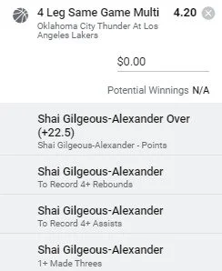 SGA has hit this line in 2 games this season including a game against the Lakers. He's also been pretty good for us on the SGMs. He's averaging 22.9ppg 5.1rpg 3.6apg with decent shooting splits. The Lakers are 2nd in the NBA in pace with a league average defense 8 games into the season. It should give SGA plenty of opportunity to rack up stats today.