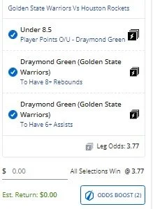 Draymond is averaging 8.6ppg 8.8rpg 6.9apg so far this season and has fit into his role doing a little bit of everything. He's hit this line in 4 of 8 games so far this year. Today against the Rockets this game profiles as a very high pace game both teams ranked in the top 5 in pace. There should be plenty of possessions and plenty of opportunity for Draymond to rack up stats. A key danger could be the points line. But we'll play the %s here we're getting better odds with a better probability on the under so that's where we go.