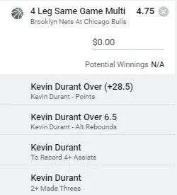 As discussed previously Kevin Durant is ballin at a very high level this season. We're running back the same bet as yeseterday, with an adjustment on the glass. KD has hit this line 4 games this season and 13 times overall for the Nets. The Bulls have been decent on defense thus far this season and their pace of play is in the bottom 10 in the league. However with the way he is playing at the moment he will be very hard to stop. Go KD 🔥🔥🔥