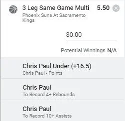 CP3 has hit this line in 4 of 8 games this season including the last 2 we bet on. He's one of the best Point Guards and passers of all time and if Sportsbet continue to serve us up these odds for this line. We'll continue to hit it where it makes sense. Today it does against a Sacramento Kings team which is top 10 in pace and about average in Point Guard defence giving up points and assists. I did consider playing the over points at 17 here but the odds on offer were $4.5 for something I think is a little less likely that the under points given what we've seen this season from CP3. Go CP3🔥🔥🔥