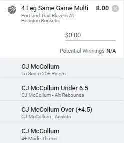 CJ McCollum 1.5 units. Take odds over $7. Now we're giving CJ one more chance here. CJ has hit this line in 3 games this season and 10 over the past 2 years. He is a capable scorer and passer who has shown he can do this. They're playing against the Houston Rockets who are top 10 in the NBA in PACE and bottom 10 in defensive rating. A nice mix for a guy like CJ to get going scoring the ball and get back on track. Go CJ 🔥🔥🔥