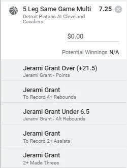 Jerami has hit this line in 3 games this season. He's hit it in about 26% of games since last year. If you remove the Under 6.5 rebound limit you'll get around $4.5 for the bet if you want to play more conservatively. The official tip is the one above and I like the extra value we're getting.