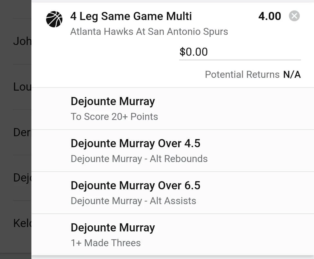 Dejounte is averaging 18.1ppg 8.3rpg 8apg. He's hit this line in 8 games this season including 2 of his last 5. Today up against a Hawks lineup that hasn't been good defensively against Point Guards giving up plenty of points and assists. Go Dejounte π₯π₯π₯