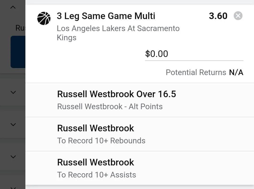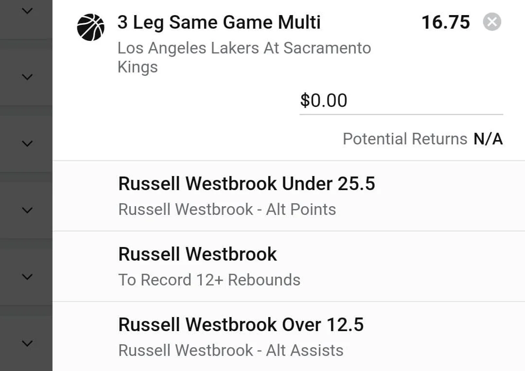 The brodie has hit this line in 3 games this season and about 15% of games over the past 2 seasons. My take is with LBJ out, Russ will take on a very large role and we're getting great value here for something that is probably around a 15% chance vs a bad Kings defense. Go Russ π₯π₯π₯