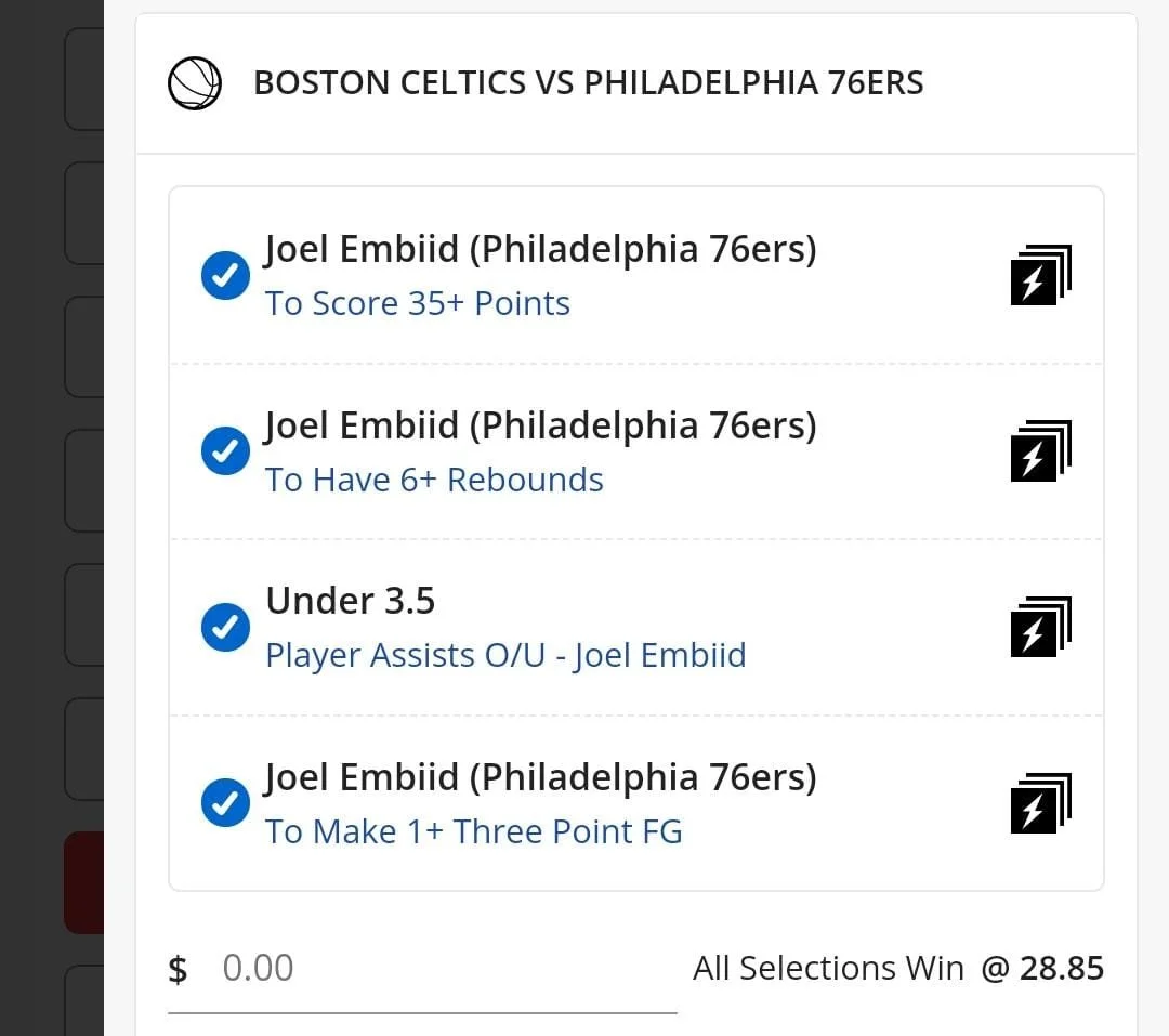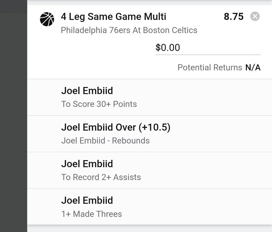 Joel Embiid 0.5 units. Take odds over $18. He's hit this line in 1 game this season. I like his matchup vs the Cs despite their defensive numbers. I don't think they can matchup 1v1 so either he goes off scoring the ball, or they commit the double team and he racks up assists. Go Joel π₯π₯π₯