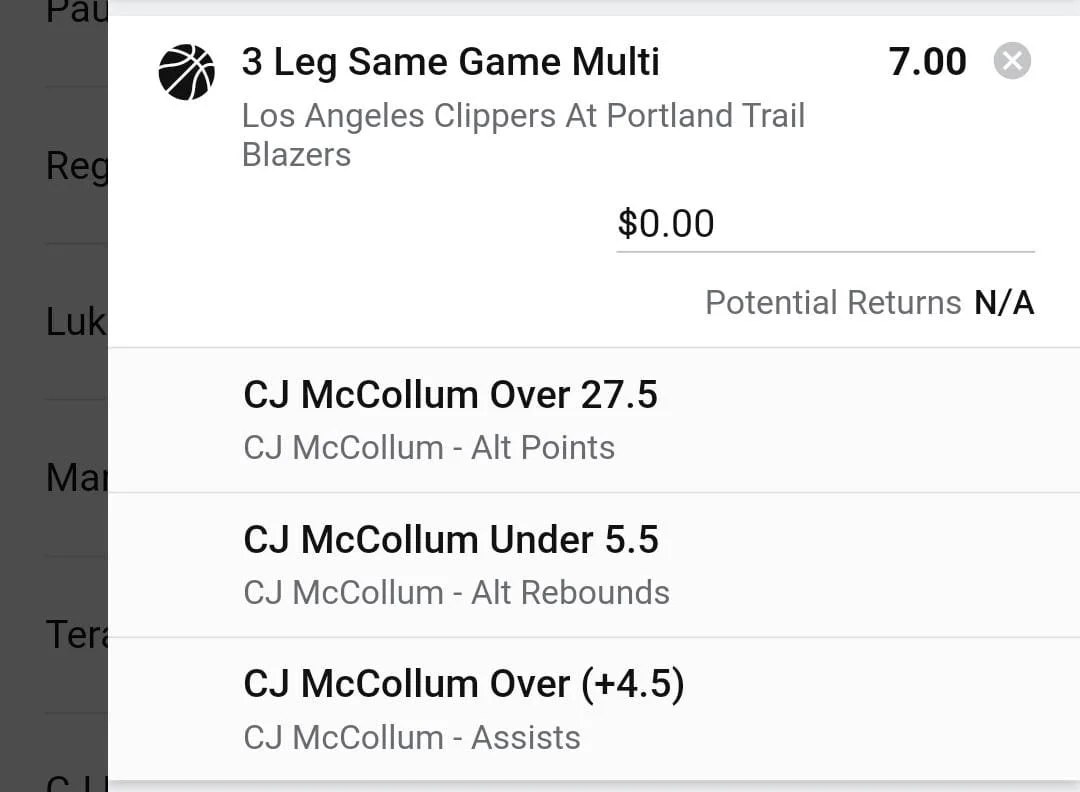 CJ is averaging 27.4ppg 4.8rpg 5.9apg in 37 career games without Damian Lillard. He's hit this line in 5 of his last 10 games without Dame including a game against the Clippers. I like his chances here against a Clippers team that are ranked 3rd in Drtg however they are not defending the point guard position as well. Go CJ 🔥🔥🔥
