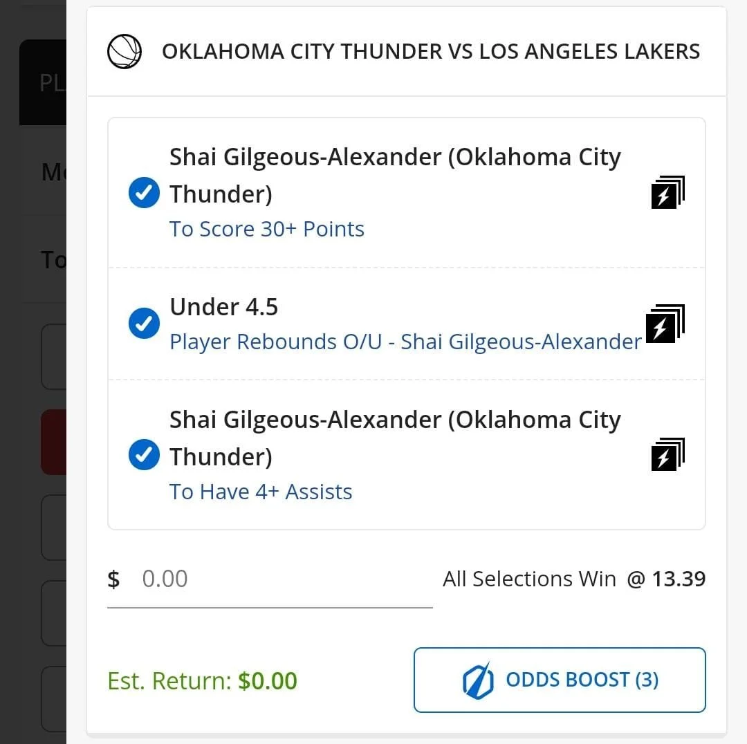 Note best odds Lads. SGA has enjoyed the matchup with the Lakers this season scoring 27 and 28 points respectively. Looking for him to take it up a notch with AD listed as questionable. Go SGA 🔥🔥🔥