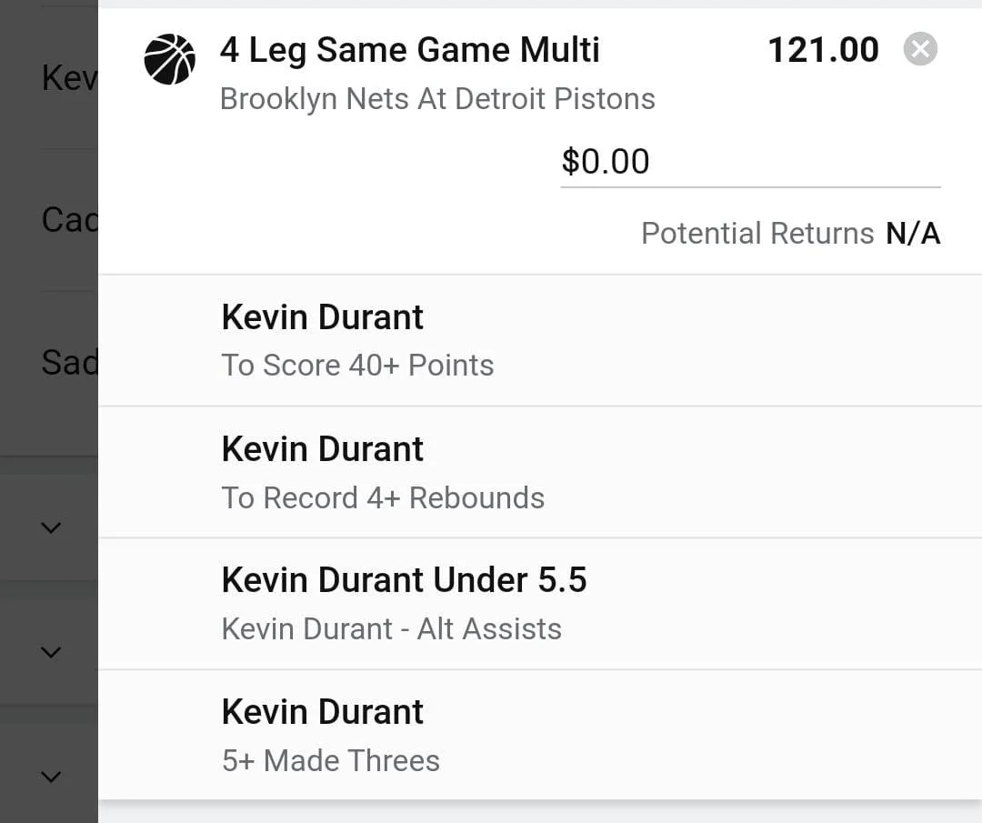 KD is leading the league in scoring this season. The Pistons are ranked 24th in Drtg. If the game plays out as enough of a contest that KD has to score, it's what he will do. He has 3 40 point games for the Nets the past 2 seasons and has gone close on a couple this year. Let's see if he can take it a step further today. Go KD 🔥🔥🔥