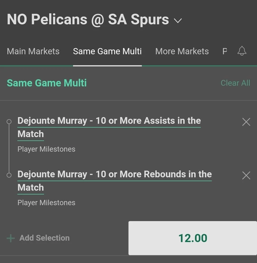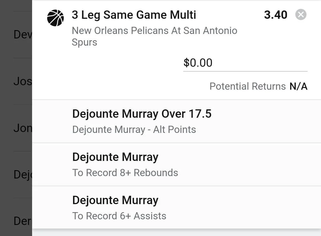 Dejounte is coming off a down game yesterday against the Nuggets in which he played limited minutes due to a blowout. I like his chances to bounce back here against a Pelicans team ranked 27th in the NBA in Drtg.