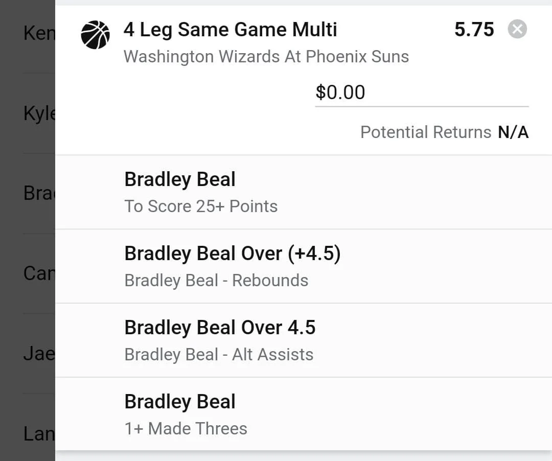 Now we run back this Bradley Beal bet. The Suns are formidable defensively so we're receiving a boost to odds. For what it's worth Brad Beal hit 34-8-9 against the Suns last season with their full lineup. Another reason I really like this matchup is Brad Beal performance is abit of an anomaly. He performs better on the road and in back to back games both about .9 ppg higher than his career averages that's fairly significant considering his career. Go Brad 🔥🔥🔥