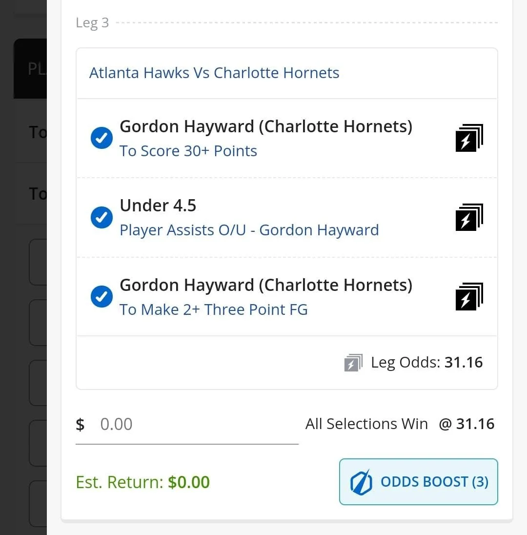 LaMelo Ball and Terry Rozier are both out today. That should mean an increase in role for Gordon Haywards against the Hawks who are also dealing with their fair share of injuries and illness. I like Gordon's chances to hit this line today he's hit it in about 20% of his career games for the Hornets but I think it's more likely than that today considering all the absences. Go Gordon 🔥🔥🔥