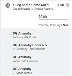 He's averaging 19.7ppg 5.6rpg 3apg. Now with Fred VanVleet a late scratch for todays game I think it will lead to a more prominent role for OG. Detroit are giving up plenty of points to the Small Forward position and I like OGs chances here. Go OG 🔥🔥🔥