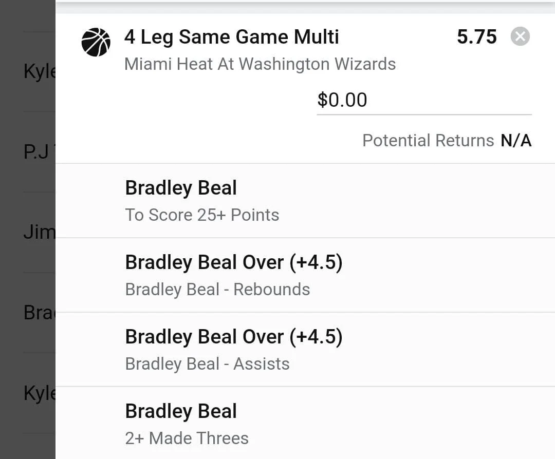 Bradley Beal is averaging 23.9ppg 5.3rpg 5.7apg he's hit this line in 4 games this season including once vs the Heat last game out and 2 games in his last 5. We went very close with Brad Beal last game vs the Heat. I've adjusted his assist line and points line and taken a little less odds, for a slightly higher probability of hitting. The Heat are very good defensively so it will be a big ask but I think Brad is a good enough player and in good enough form to hit it. Go Bradley Beal 🔥🔥🔥