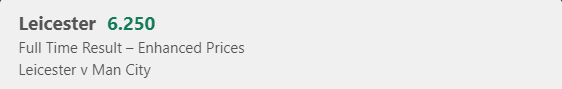 Leicester Win - Stake 1 Unit, Minimum Odds 5.4, Best Book - BET365