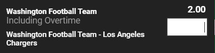 Washington Football Team Win - Stake 2 Units, Minimum Odds 1.9, Best Book - UNIBET