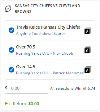 Browns/Chiefs SGM - Stake 1.5 Units, Minimum Odds 5.6, Best Book - Lads/Neds