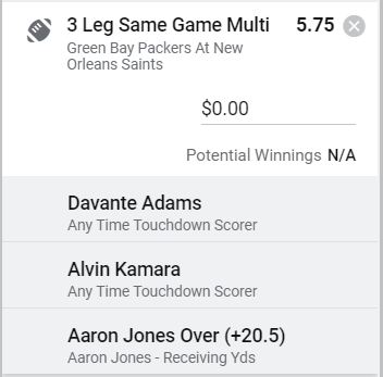 Packers/Saints SGM - Stake 1.5 Units, Minimum Odds 5.0, Best Book - Sportsbet