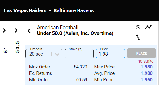Ravens/Raiders Total Under 50 - Stake 2 Units, Minimum Odds 1.90, Best Book - Sportsmarket