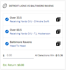 Ravens/Lions SGM - Stake 1.5 Units, Minimum Odds 4.6, Best Book - Lads/Neds