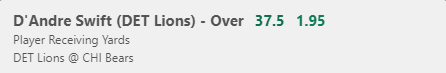 D’Andre Swift Over 37.5 Receiving Yards - Stake 2 Units, Minimum Odds 1.87, Best Book - BET365