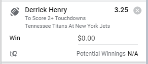 Derrick Henry 2+ Touchdowns - Stake 1.5 Units, Minimum Odds 2.75, Best Book - Sportsbet