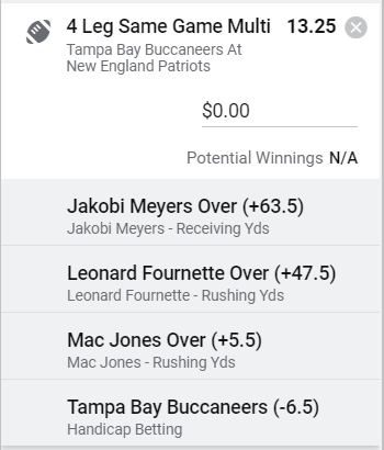 Bucs/Pats SGM - Stake 0.5 Units, Minimum Odds 10, Best Book - Sportsbet