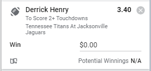 Derrick Henry 2+ Touchdowns - Stake 1.5 Units, Minimum Odds 3.0, Best Book - Sportsbet