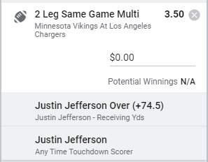 Justin Jefferson SGM - Stake 1.5 Units, Minimum Odds 3.0, Best Book - Sportsbet