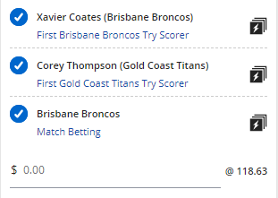Broncos VS Titans SGM - Stake 0.25 Units, Minimum Odds 80.00, Best Book Lads/Neds