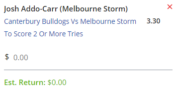 To Say Josh Addo-Carr is due could be a great understatement, and it’s not for lack of trying. The Fox has been very unlucky this season to not have any more than one try and he came close to a few last week. Addo-Carr loves playing against the Bulldogs and has bagged a double in his last three games straight. The best odds are at Lads/Neds but take $3.00 or more anywhere else. 1 Unit.