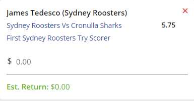 Tedesco First Roosters Try Scorer - Stake 1 Unit, Minimum Odds $5.25, Best Odds Lads/Neds