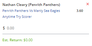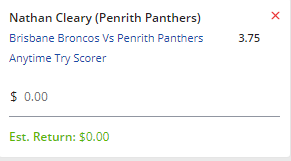 Nathan Cleary Try - Stake 1 Unit, Minimum Odds 3.0, Best Book - Lads/Neds