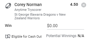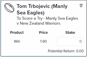 Tom Trbojevic Try - Stake 2.5 Units, Minimum Odds 1.8, Best Book - Lads/Neds
