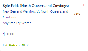 Kyle Feldt Try - Stake 3 Units, Minimum Odds 1.87