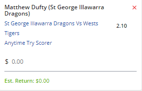 Matthew Dufty Try - Stake 2 Units, Minimum Odds 1.90