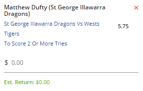 Dufty 2+ Tries - Stake 0.5 Units, Minimum Odds 4.75